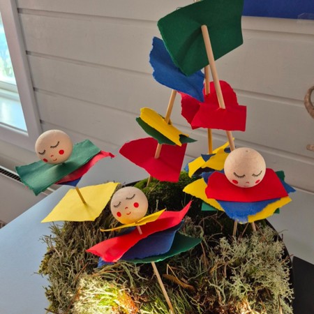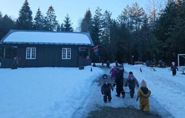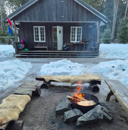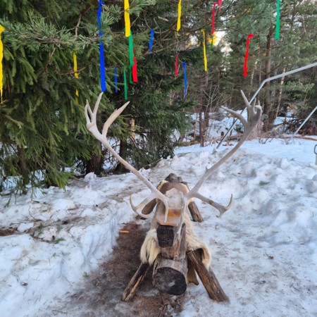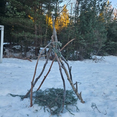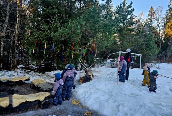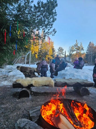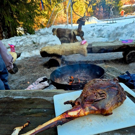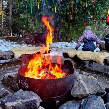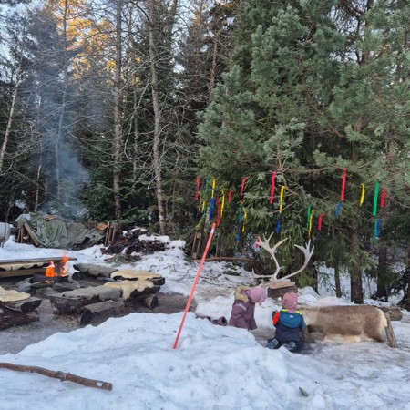 En samlet feiring med Skautroll og Bever ved varmestua. Lassokasting på selvprodusert rein, vi fikk smake på rådyrkjøtt tilberedt av en mamma og varmet opp på bålet. Dans til musikk og joik akkompagnert fra høyttaler ute. Ekornbarna hadde sin egen feiring med måltidet inne. Mye fin kunst er å finne både ute og inne ved alle avdelinger.