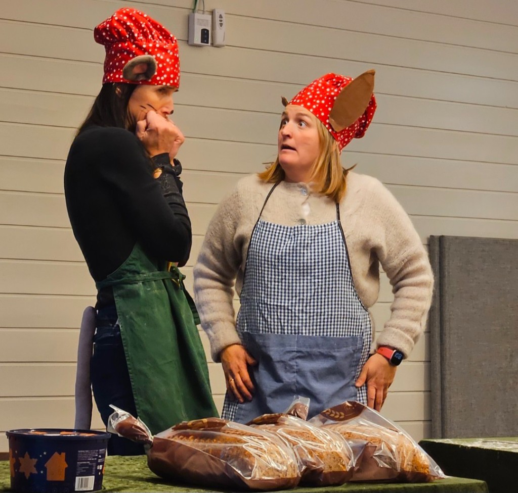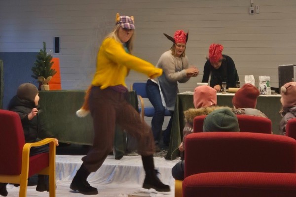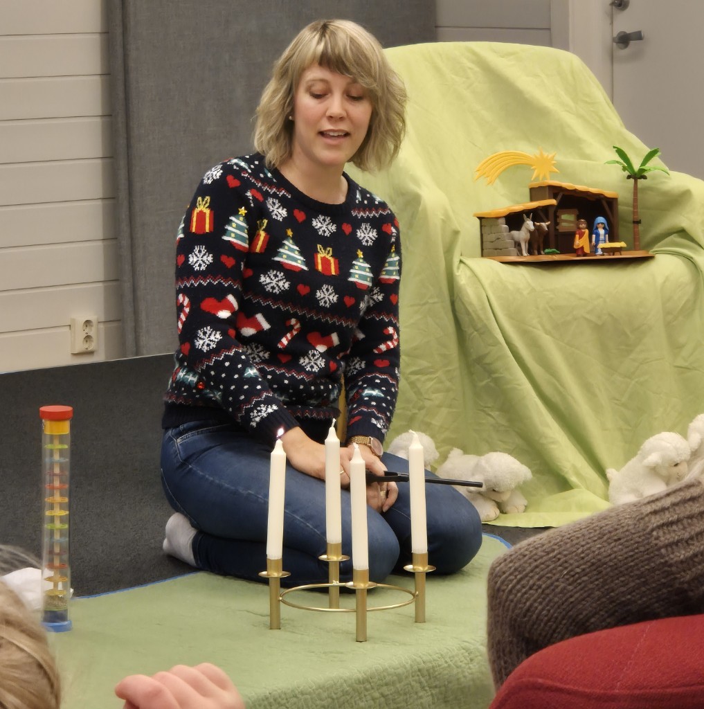 Vi får besøk av presten Ingvild fra misjonskirken på Myra. Hun formidler engasjert fortellingen fra juleevangeliet, med hjelp av bilder og rekvisitter. Barna blir oppfordret til å være delaktige i samlingen, og lot seg engasjere