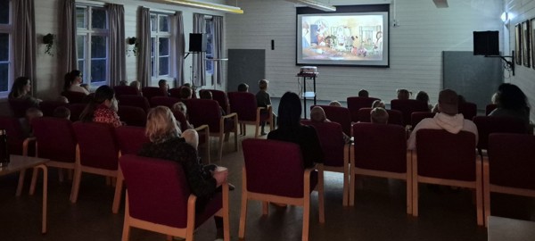 Storesalen blir rigget med prosjektor og fremvisning av julefilm på lerret. "Jul med Astri Lindgren" og neste dag får de se noe fra "langbens jul"