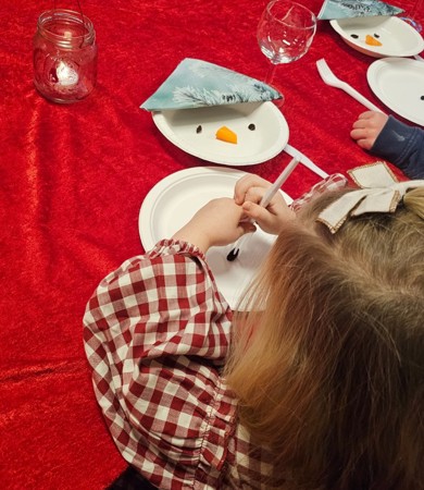 Stivpyntede barn blir servert kalkunmiddag nede i lillesalen, det er dekket med stettglass og snømanntallerkener. Noen av de største barna var med på å gjøre i stand til det hele.
