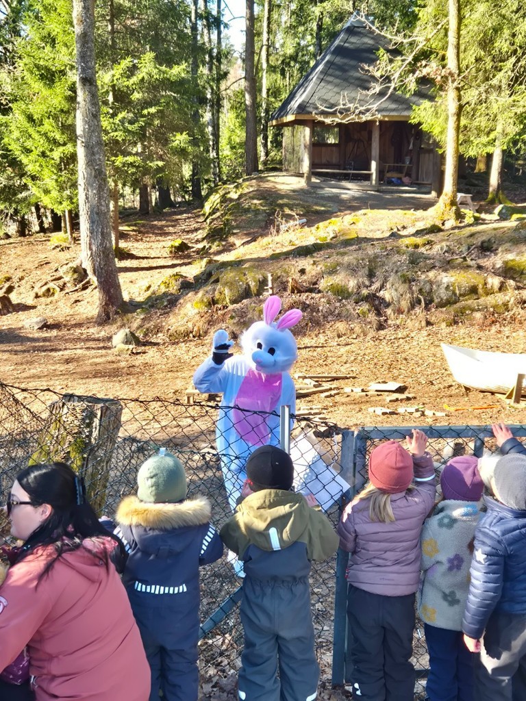 Det var ikke minst veldig spennende å få se påskeharen som fortsatt er like raus med barna, og legger fra seg påskeegg 🐇🥚 - Mange fryderop fulgte da haren prøvde å komme seg usett inn i nøtteskogen. Og tilslutt må påskeharen bort å hilse på alle de glade barna.